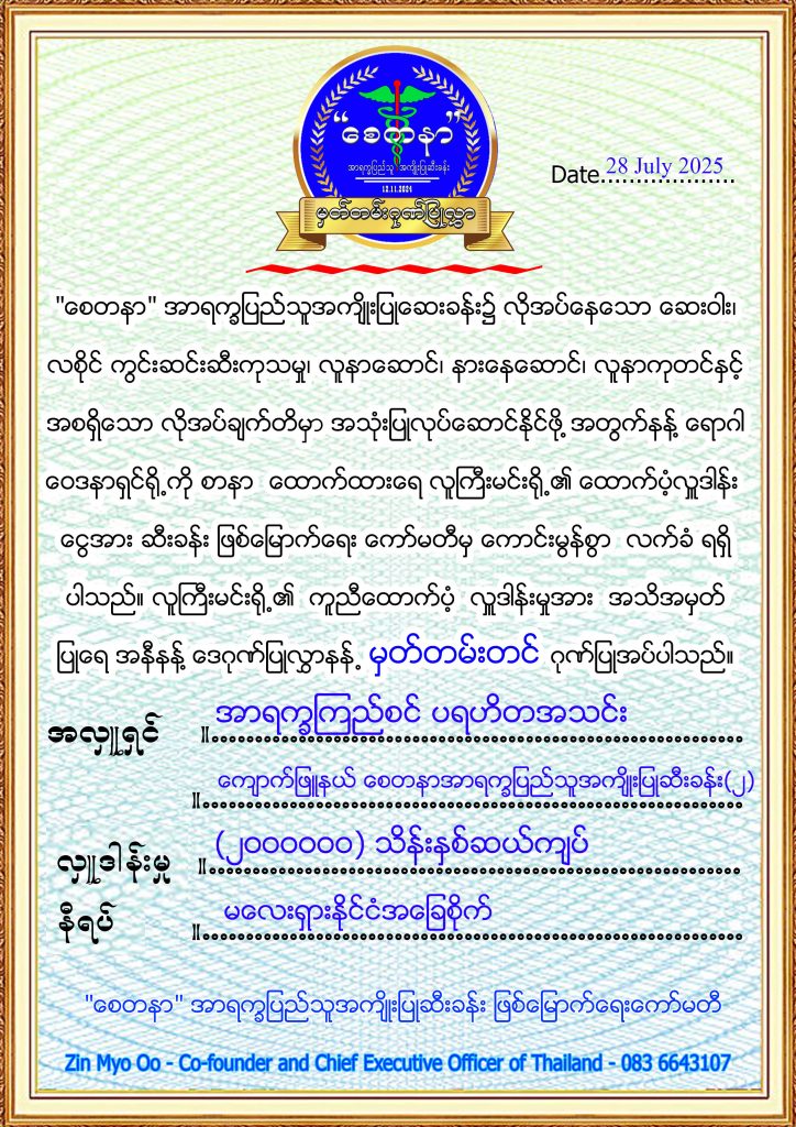 The Arakkha Kyal Zin Charitable Association, based in Malaysia, has donated (200,0000) kyats to Kyaukphyu Township Clinic since 28.7.2025.